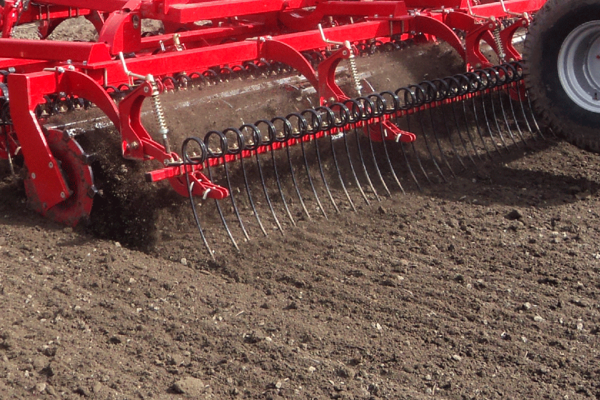 En langfingerefterharve kan med fordel monteres bag fladjernsvalsen eller en svær rørvalse på lettere jordtyper, da den sørger for at lave struktur i overfladen, så sandflugt modvirkes.